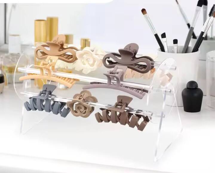 Organize in style with this 360° rotating acrylic headband and claw clip holder. Size 30*21cm, durable and clear design. Perfect for displaying, storing, and accessing accessories easily while keeping your vanity neat and elegant.