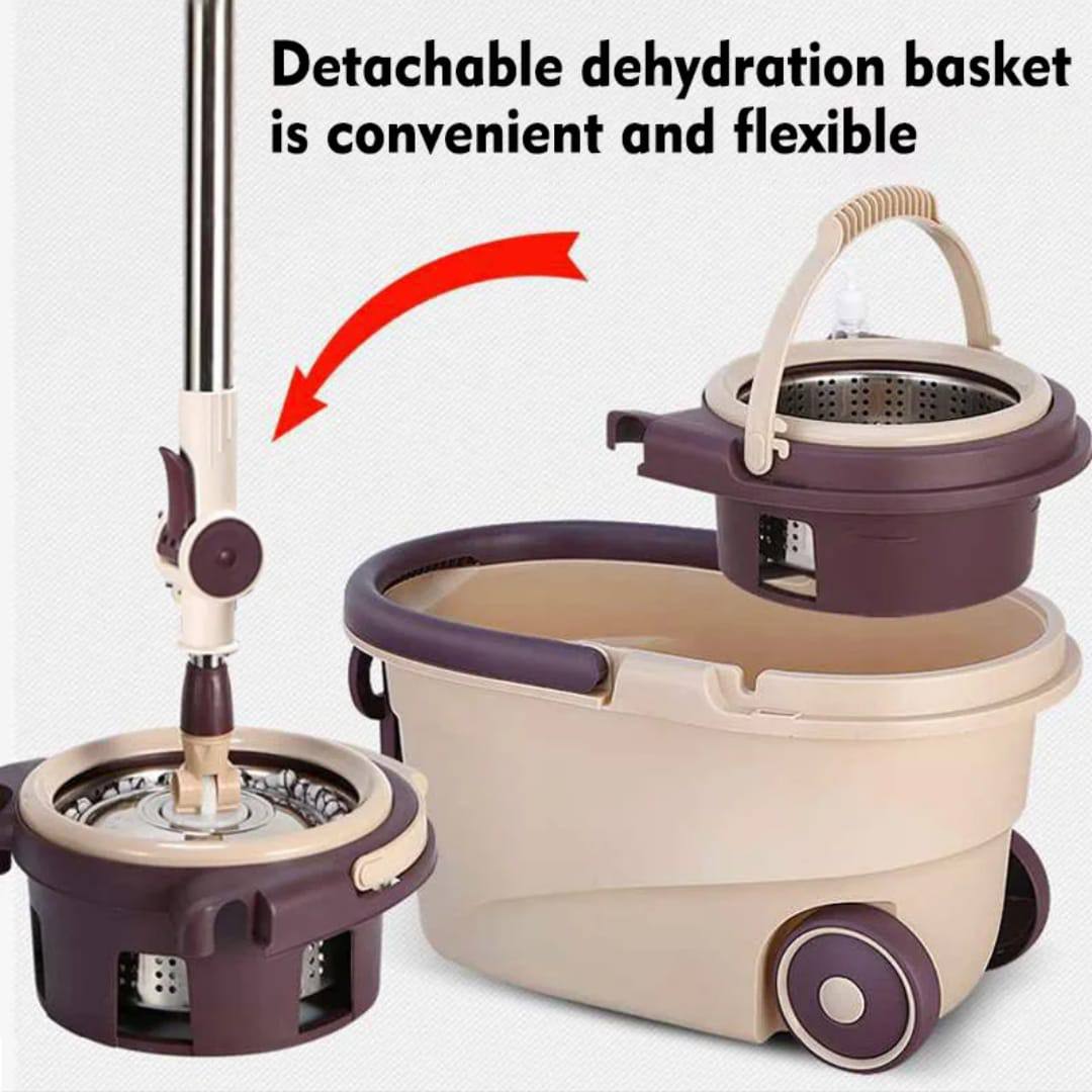 Clean effortlessly with this 360° spin mop and bucket set. Features two mop heads, stainless steel spin basket, large wheels, built-in soap dispenser, splash-proof bucket, and ergonomic telescopic handle—perfect for tiles, wood, laminate, marble, and more.