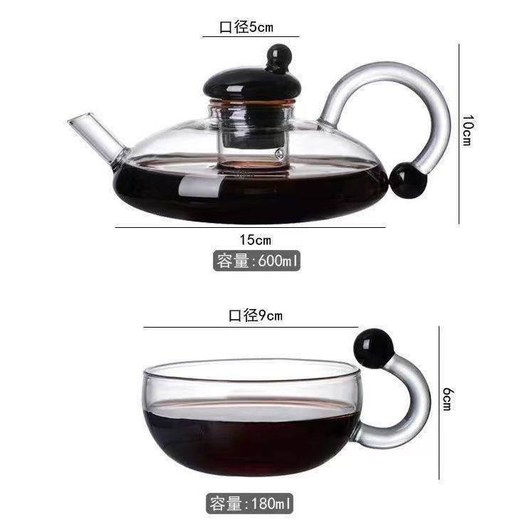 Enjoy tea time in style with this 5-piece heat-resistant glass tea set. Includes 4 cups (280ml each) and a 600ml kettle with infuser. Available in dark and clear, combining elegance, durability, and functionality for every occasion.