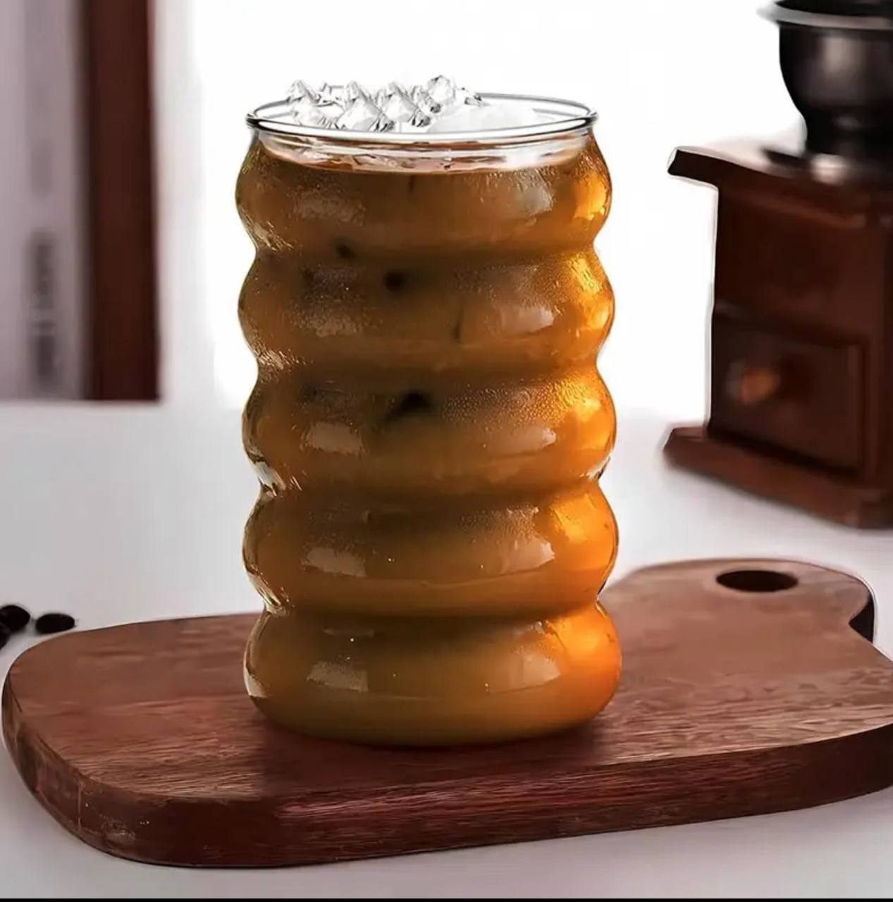 Sip in style with this 500ml borosilicate ripple wave glass cup featuring a bamboo lid. Perfect for beer, juice, iced coffee, or cocktails. Durable, elegant, and eco-friendly—ideal for daily use or entertaining guests.
