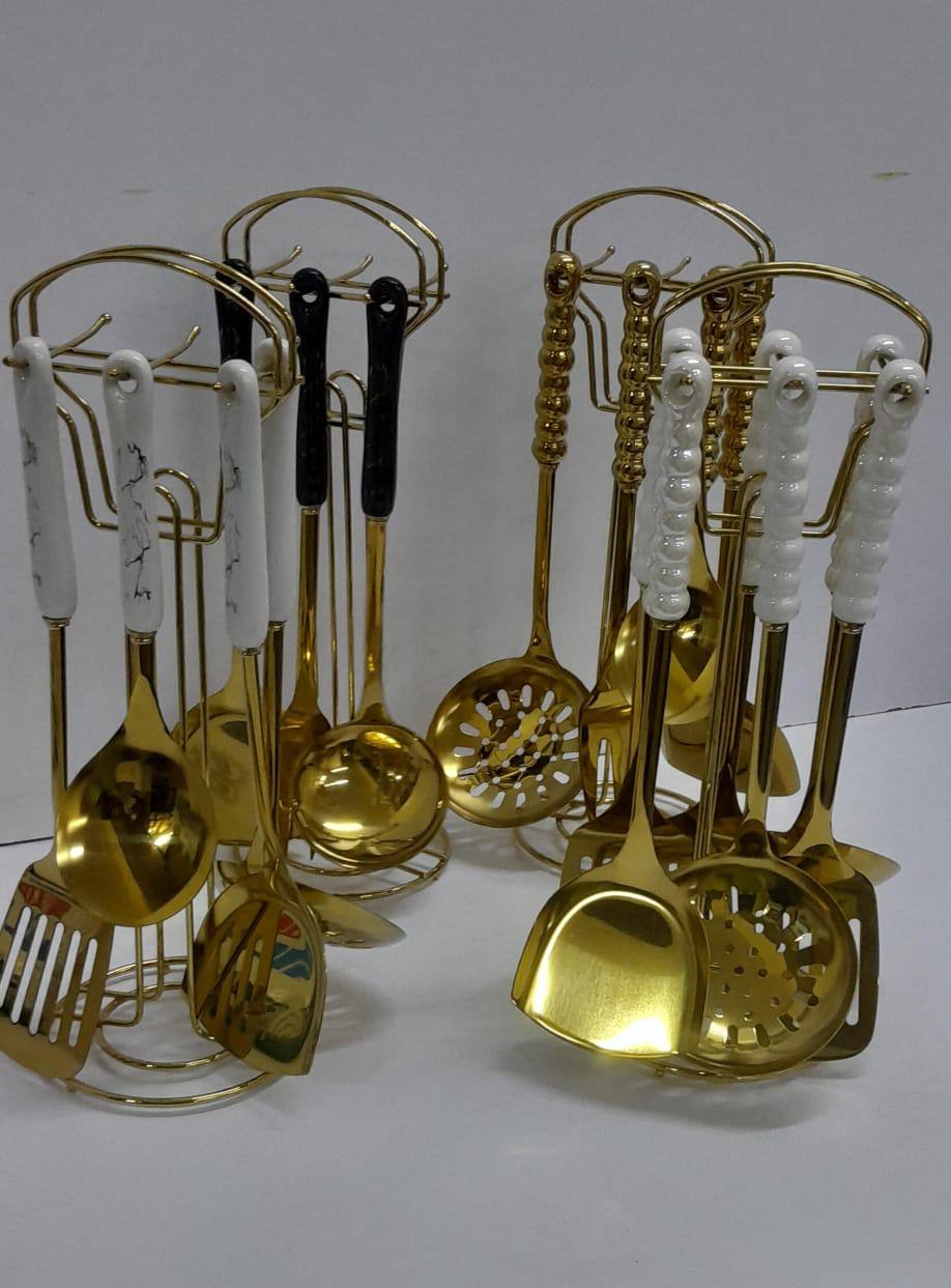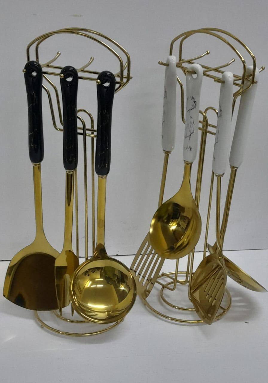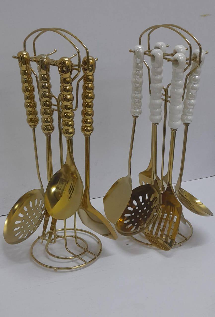 Elevate dining with this 7-in-1 Nordic ceramic handle stainless steel serving spoon set. Available in white, black, and gold, it blends durability with elegance. Perfect for daily use or special occasions, adding style to every table.