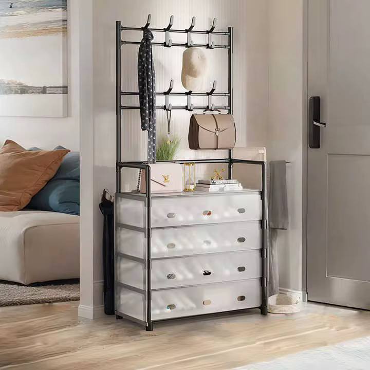 Organize in style! This five-tier shoe rack with 8 utility hooks is perfect for shoes, handbags, hats, keys, and clothes. Ideal for hallways, it offers smart storage in sleek white or black finishes.