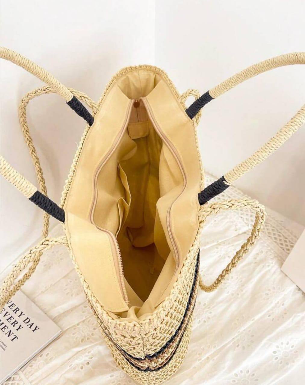 Add chic Parisian flair with the French Color Block Woven Tote Bag — 43×9×16cm. Featuring a secure zipper closure and soft lining, it’s stylish, lightweight, and perfect for effortless everyday elegance or weekend outings.