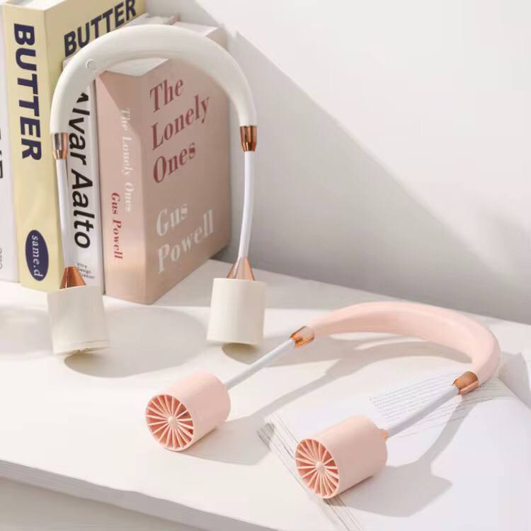 Gold hanging neck small fan with USB charging and three-speed adjustable settings. Portable, silent, and leafless, it keeps you cool outdoors or indoors—perfect for summer, home, office, travel, or on-the-go comfort with stylish convenience.