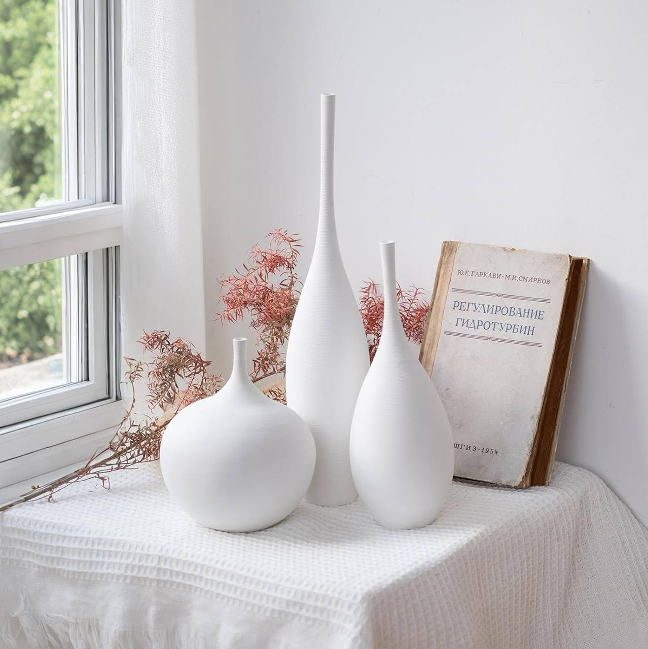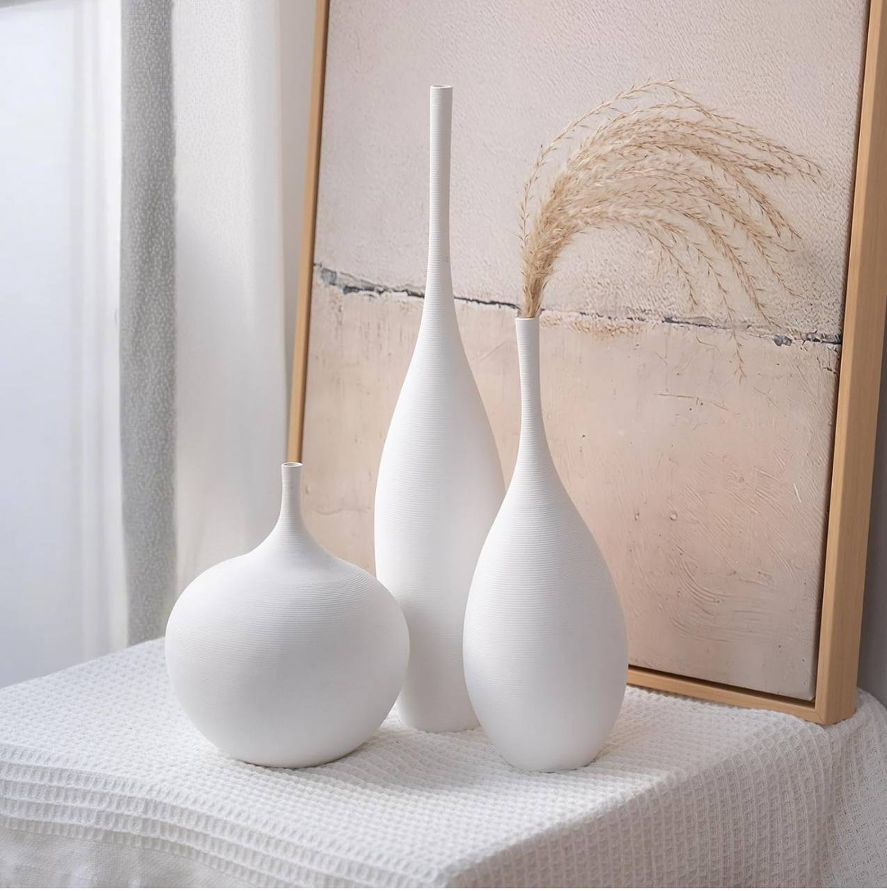 Bring sophistication home with this 3pc luxury white brushed ceramic vase set. Sizes 38x8cm, 25x8cm, and 17x15cm. Elegant and versatile, perfect for fresh flowers, dried arrangements, or standalone décor to elevate any interior style.