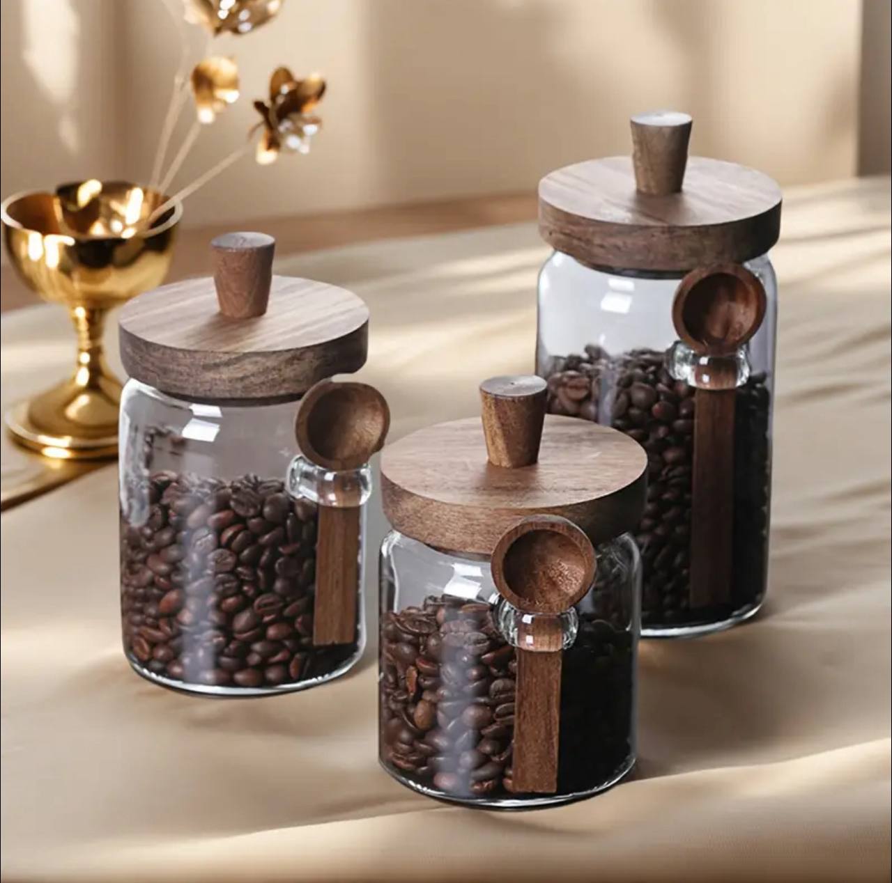 Mulit-purpose Modern Glass Sealed storage Jars with Acacia wood lid and Spoons