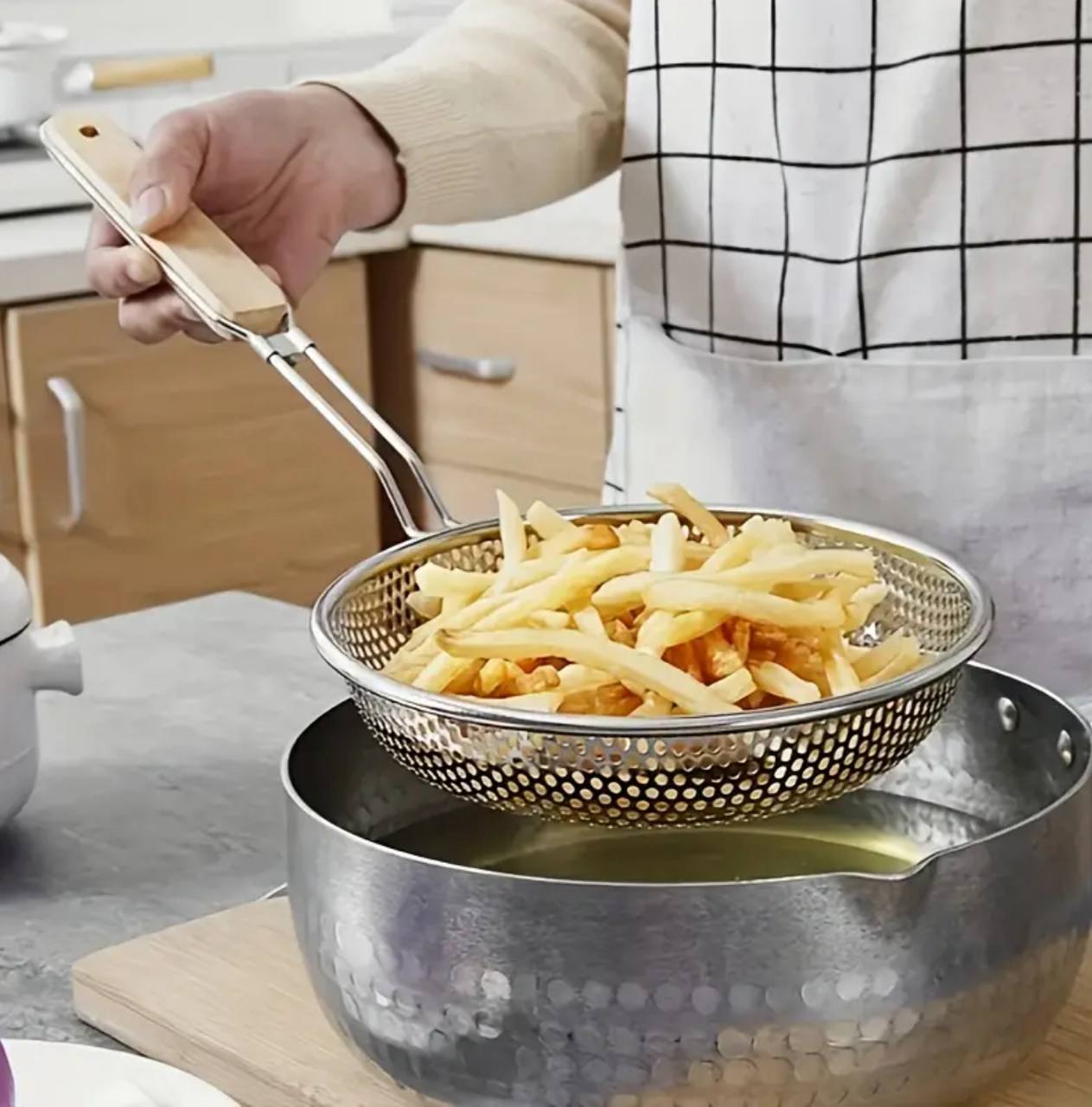 Cook with ease using this stainless steel skimmer with wooden handle! Featuring a fine mesh perforated filter, it’s multifunctional, durable, and easy to clean without hiding dirt—perfect for frying, straining, or scooping with style.